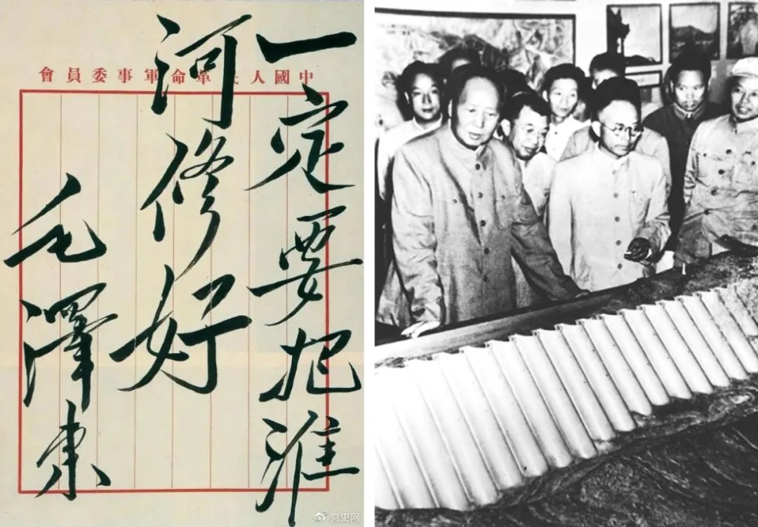歷史上的這里,由于缺乏有效治理,河道淤積,旱澇災害頻發(fā)。1950年夏季,淮河流域連降暴雨,雨水匯聚成滾滾洪流,摧毀房屋,淹沒農田,“數百里的河堤全部失去作用”。1950年5月,淮河水利工程總局對史河、灌河進行了查勘,提出上游建梅山水庫的意見。1951年毛澤東主席發(fā)出號召“一定要把淮河修好”,同年4月,第二次治淮會議決議的《治淮方略》和1952年度工程要點,確定興建史河梅山水庫。