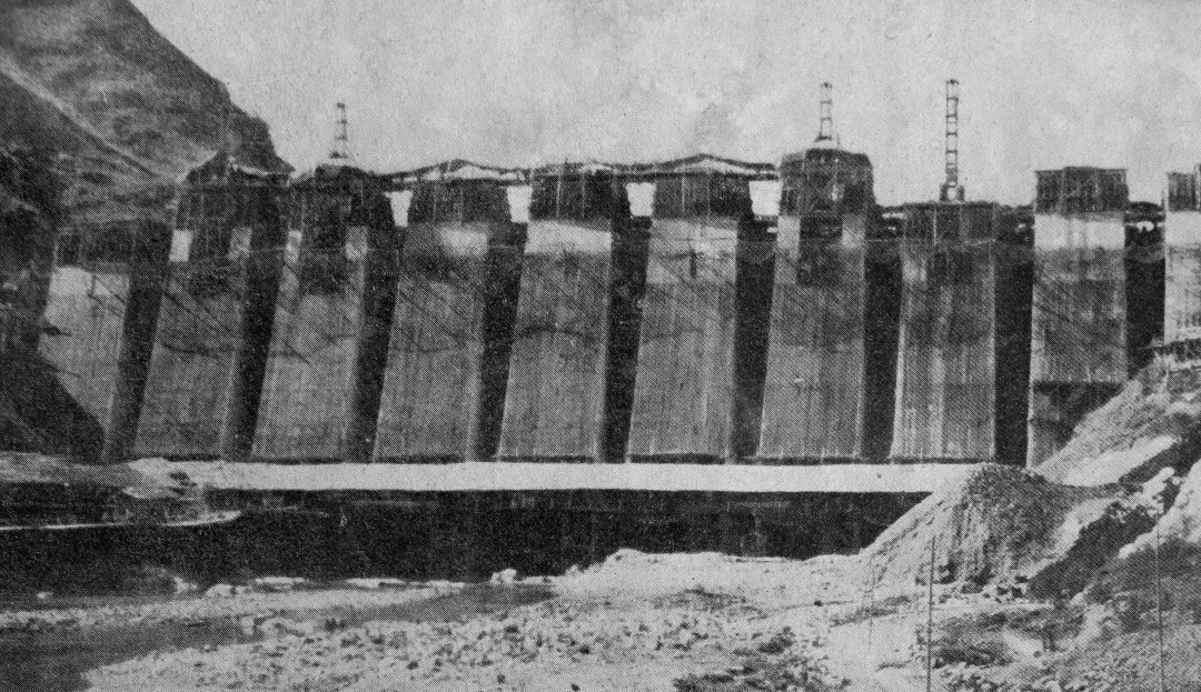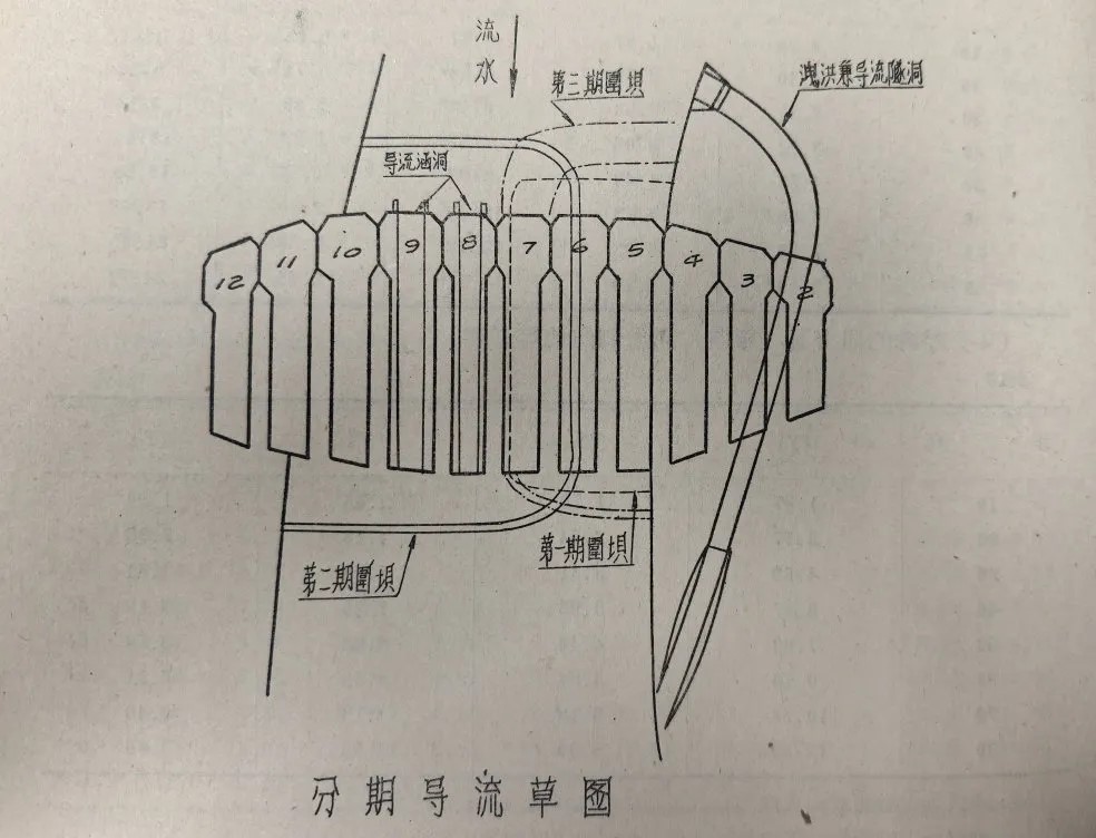 完成前期的關(guān)鍵準(zhǔn)備工作,1956年9月工程開工建設(shè),由治淮委員會勘測設(shè)計院組建磨子潭水庫工程指揮部負(fù)責(zé)施工。由于水庫位于大別山區(qū)淠河上游,地形上為峽谷,河床寬度僅有90米,且兩岸山坡陡峻,坡度在1:1至1:1.4之間,并有局部陡壁存在,因此清基爆炸數(shù)量大。按原定計劃,大壩開工前應(yīng)當(dāng)鑿?fù)ㄐ购樗矶醋鳛榇髩问┕て陂g導(dǎo)流之用,上下游做好圍壩,進行基礎(chǔ)開挖,然后再澆筑大壩混凝土。泄洪隧洞于1956年9月中旬開挖,而大壩要求1957年汛期就要起到攔洪作用,因此磨子潭水庫施工期限十分短促。為及時完成要求,磨子潭水庫工程指揮部結(jié)合當(dāng)?shù)氐牡刭|(zhì)特點等,采用了分三期導(dǎo)流、分區(qū)爆炸、分區(qū)澆筑混凝土的方案,成功完成了約33萬立方米的混凝土澆筑。