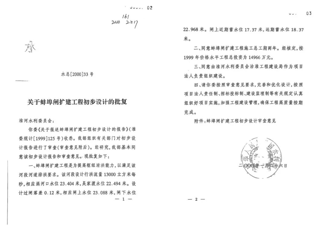 2000年1月26日,水利部以水總〔2000〕33號文正式批準了蚌埠閘擴建工程初步設(shè)計,批復概算總投資為14966萬元。2000年11月23日,蚌埠閘擴建工程主體工程開工,歷經(jīng)三年的緊張施工,于2003年11月順利通過竣工驗收。